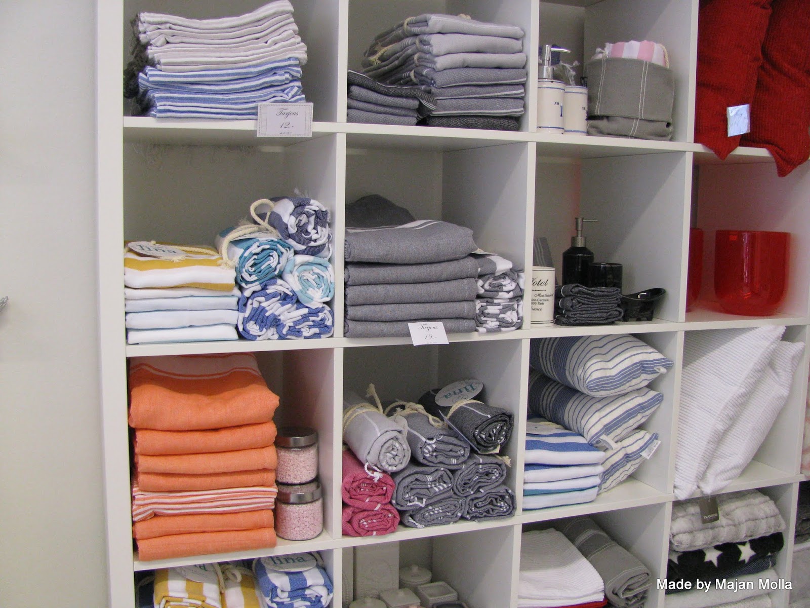 Saippuat ja muut tyylikkäissä pumppupulloissa ja purkkeissa. Nämä sopivat hyvin WC: hen ja myös keittiön tasoilla rauhoittavat kaaosta. Kuvasssa olevia pikkupyyhkeitä siirtyi myös minun kassiin. Materiaalia ohutta nopeasti kuivuvaa puuvillaa. Näitä löytyi myös kylpypyyhkeinä, mutta enhän kaikkea voinut ostaa.